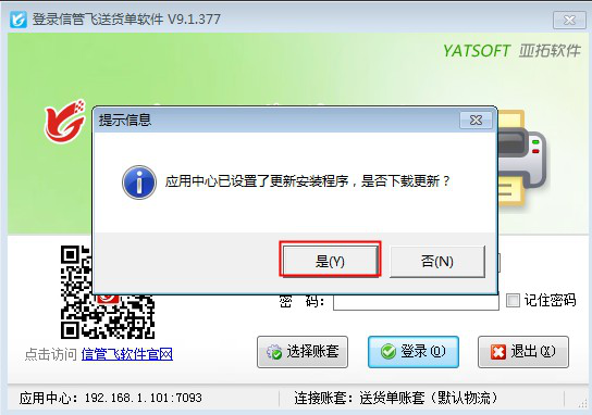 ????點(diǎn)擊確定按鈕后會(huì)提示“應(yīng)用中心已設(shè)置了更新安裝程序,是否下載更新”,點(diǎn)擊“是”即可,會(huì)自動(dòng)下載和應(yīng)用中心版本一致的程序,如下圖所示: