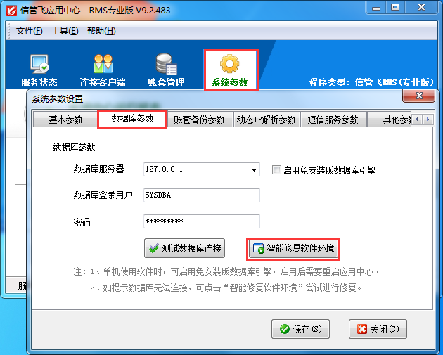 ????2、點(diǎn)擊“系統(tǒng)參數(shù)”,在“數(shù)據(jù)庫(kù)參數(shù)”頁(yè)點(diǎn)擊“智能修改軟件環(huán)境”。(也可點(diǎn)擊菜單“幫助----智能修復(fù)軟件環(huán)境”)