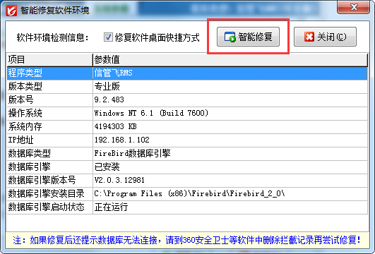 ????3、進(jìn)入智能修改軟件環(huán)境窗口,點(diǎn)擊“智能修復(fù)”即可,修復(fù)完成,請(qǐng)重新啟用“信管飛RMS應(yīng)用中心”。