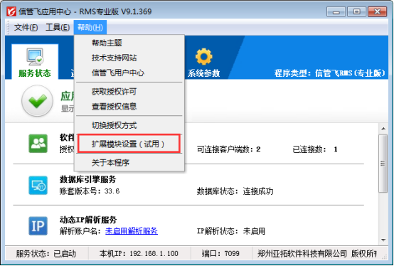 ????首先運(yùn)行信管飛RMS軟件應(yīng)用中心,打開(kāi)信管飛RMS軟件應(yīng)用中心主界面,點(diǎn)擊“幫助”—》“擴(kuò)展模塊設(shè)置(試用)”,打開(kāi)擴(kuò)展模塊設(shè)置(試用)界面,如下圖所示。