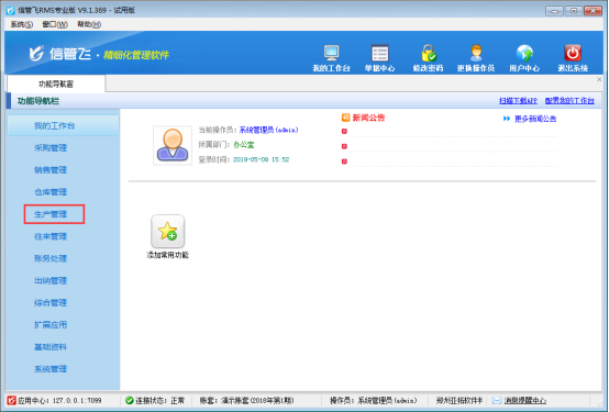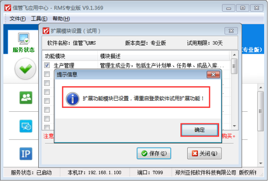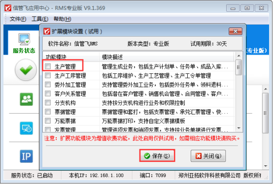 ????在擴(kuò)展模塊設(shè)置(試用)界面選擇需要試用的擴(kuò)展功能模塊(如生產(chǎn)管理模塊)并保存設(shè)置(需要注意的是擴(kuò)展功能模塊是屬于增值收費(fèi)功能模塊,此處啟用相應(yīng)功能模塊是僅供試用,試用期限為30天,如果需要長(zhǎng)期使用相應(yīng)功能模塊請(qǐng)購(gòu)買(mǎi)),然后重新登錄軟件即可試用擴(kuò)展功能模塊。