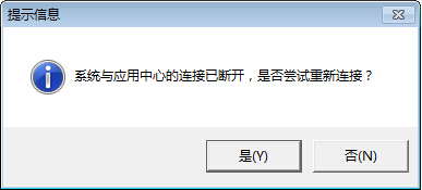 ????第一種解決方式:鼠標(biāo)雙擊軟件界面最下方的“連接狀態(tài):已斷開(kāi)”字樣,系統(tǒng)會(huì)彈出“系統(tǒng)與應(yīng)用中心的連接已斷開(kāi),是否嘗試重新連接?”提示信息,如圖所示,點(diǎn)“是”按鈕,客戶端程序會(huì)嘗試重新建立與應(yīng)用中心程序的連接。如果連接成功即可打開(kāi)相應(yīng)的功能,繼續(xù)使用軟件。