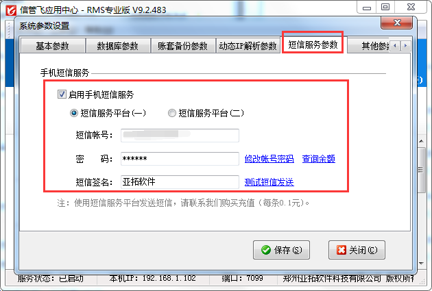 ????打開(kāi)信管飛RMS軟件應(yīng)用服務(wù)中心—》系統(tǒng)參數(shù)—》短信服務(wù)參數(shù),如下圖所示。