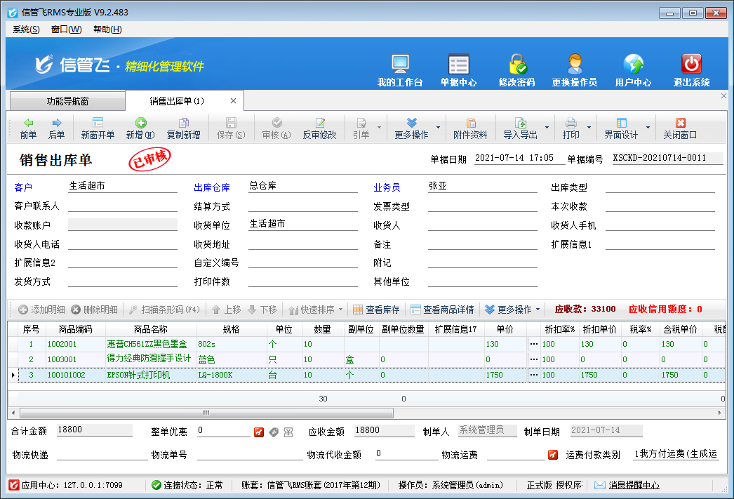 ????1、開(kāi)銷售出庫(kù)單保存并審核,如下圖所示。