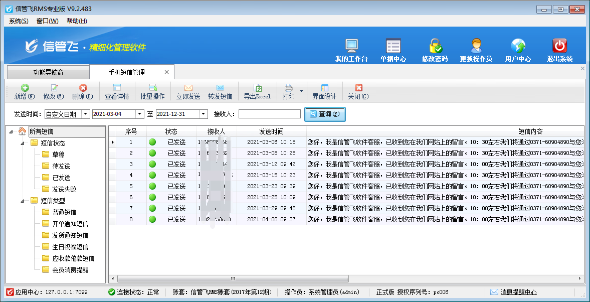 ????信管飛RMS專業(yè)版、標(biāo)準(zhǔn)版、星光版都是支持手機(jī)短信功能,我們可以根據(jù)自己的業(yè)務(wù)需求選擇相應(yīng)的版本,下面我們以信管飛RMS專業(yè)版為例介紹一下手機(jī)短信功能的使用方法及步驟: