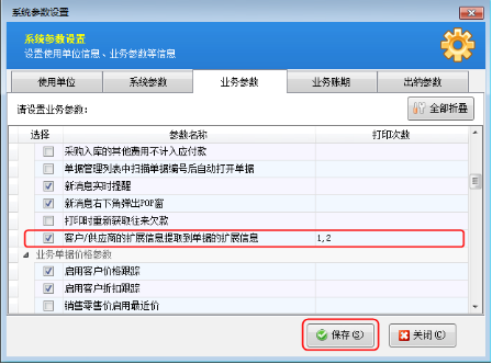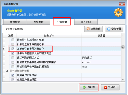 ????軟件中默認(rèn)是允許開單時(shí)直接錄入新客戶/供應(yīng)商的。如果該業(yè)務(wù)參數(shù)沒有被勾選,需要我們在使用此功能之前對相應(yīng)的業(yè)務(wù)參數(shù)進(jìn)行設(shè)置。在“業(yè)務(wù)參數(shù)”界面上我們將“開單允許直接錄入新客戶”勾選上,然后進(jìn)行保存。