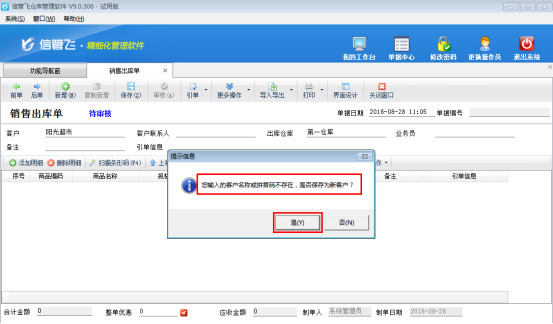 ????此時(shí)我們即可到銷售或采購業(yè)務(wù)單據(jù)開單界面上進(jìn)行直接錄入新客戶/供應(yīng)商的操作,我們以開銷售出庫單為例來演示一下具體操作流程。在銷售出庫單上面輸入新客戶的名稱,然后鼠標(biāo)點(diǎn)一下其他任意一個輸入框,軟件中會提示“您輸入的客戶名稱或拼音碼不存在,是否保存為新客戶?”這時(shí)我們點(diǎn)擊“是”即可,填寫銷售出庫單的其他信息后保存單據(jù),具體的操作界面如圖2所示。然后在“基礎(chǔ)資料”—》“客戶信息”里面可以查看到剛才新增的客戶信息。