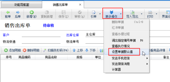 ????登錄軟件,在功能導(dǎo)航窗點(diǎn)“銷售管理”—》“銷售出庫單”,進(jìn)入新開銷售單界面,如圖2所示,點(diǎn)擊“更多操作”按鈕,點(diǎn)擊“設(shè)置單據(jù)默認(rèn)值”,系統(tǒng)彈出“設(shè)置單據(jù)默認(rèn)值”窗口,如圖3所示。