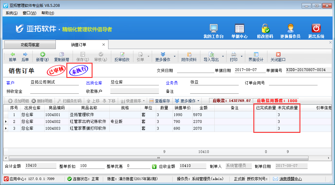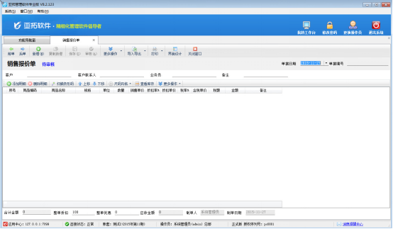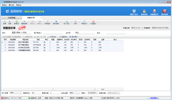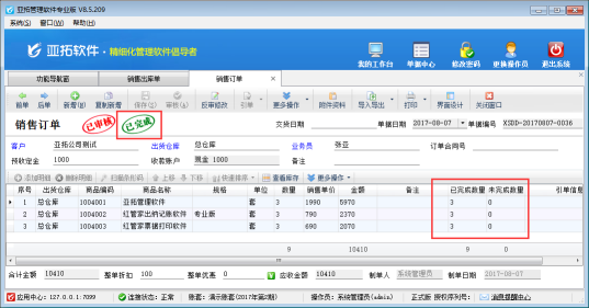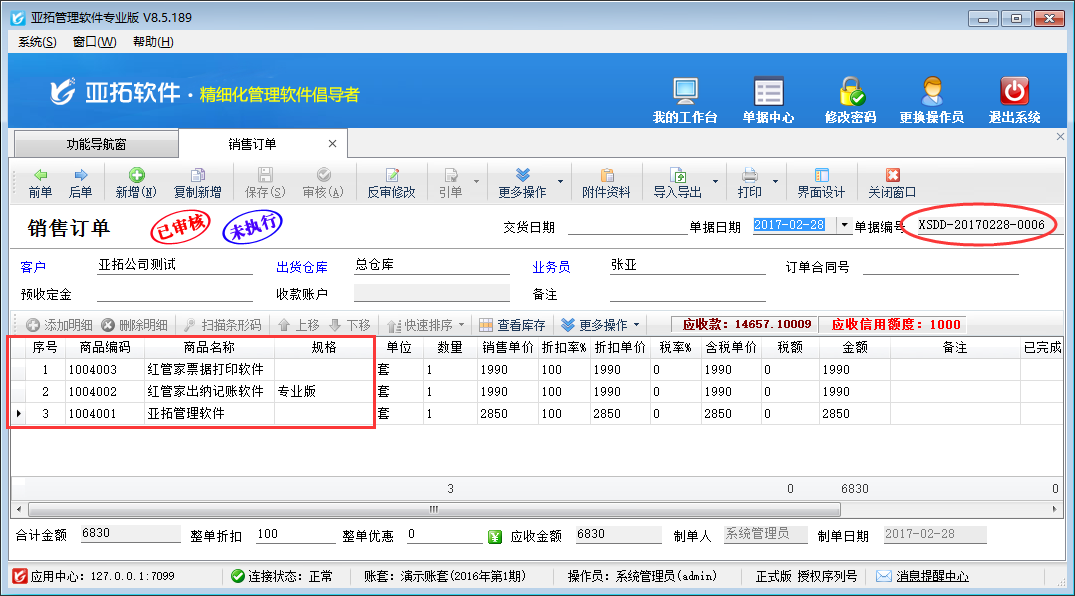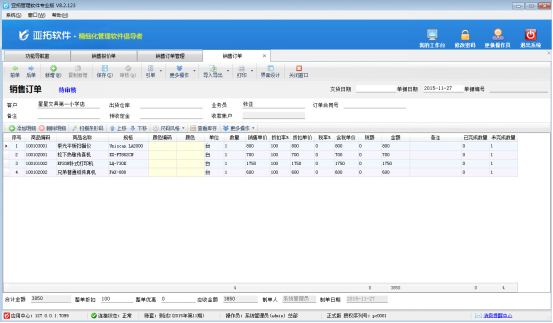 ????亞拓管理軟件星光版、標(biāo)準(zhǔn)版、專業(yè)版都支持在開采購訂單時(shí)直接引用銷售訂單明細(xì)數(shù)據(jù),以專業(yè)版軟件為例,開采購訂單時(shí)如何直接引用銷售訂單明細(xì)數(shù)據(jù)?首先我們先開一個銷售訂單,保存并審核,如下圖所示: