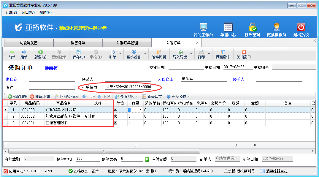 ????亞拓管理軟件和紅管家倉庫管理軟件新增采購單/銷售單后都可以直接保存并審核單據(jù),軟件還支持批量審核采購單/銷售單,如果您每天錄單數(shù)量較多,為了節(jié)省寶貴時(shí)間提高工作效率,您可以使用批量審核采購單/銷售單功能。下面我們介紹一下在亞拓管理軟件專業(yè)版中批量審核采購單的具體的操作步驟。