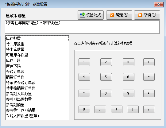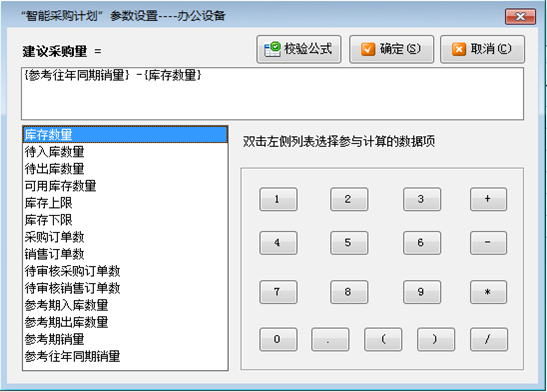 ????(1)參數(shù)設(shè)置:可以設(shè)置“建議采購量”的運(yùn)算公式,軟件將根據(jù)您設(shè)計(jì)的公式計(jì)算出建議數(shù)量。