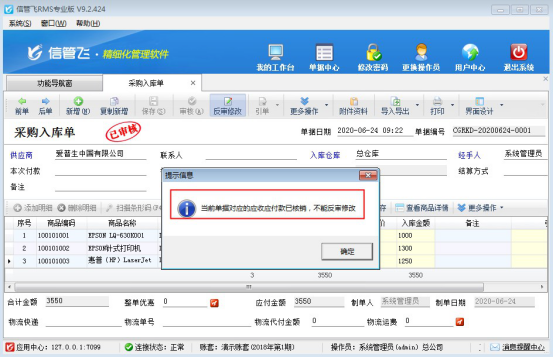 ????亞拓軟件自主開發(fā)的信管飛RMS軟件支持將采購入庫單進(jìn)行付款結(jié)銷操作,有時(shí)可能存在采購單商品明細(xì)開錯的情況。如果當(dāng)前采購入庫單的應(yīng)付款已結(jié)銷,軟件是不允許再修改此單據(jù)的,如下圖所示: