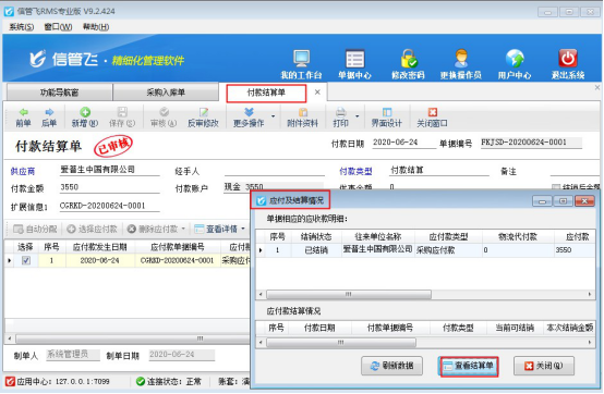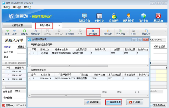 ????本篇文章以信管飛RMS為例,示范下如何修改應(yīng)付款已結(jié)銷的采購入庫單單據(jù),打開應(yīng)付款已結(jié)銷的采購入庫單單據(jù),在更多操作下點(diǎn)擊“查看應(yīng)付款及結(jié)銷情況”,彈出應(yīng)付款及結(jié)銷情況界面,點(diǎn)擊“查看結(jié)算單”可以打開本單據(jù)的應(yīng)付款結(jié)算單界面,如下圖所示: