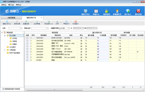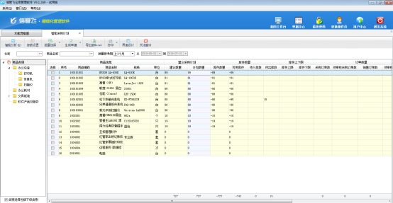 ????信管飛倉庫管理軟件支持由智能采購計(jì)劃生成采購計(jì)劃單。智能采購計(jì)劃可根據(jù)當(dāng)前庫存情況,并可結(jié)合庫存上下限、同期銷售量、銷售訂單數(shù)量、待審核數(shù)量等條件進(jìn)行組合運(yùn)算,從而給出建議的商品采購量。可以把建議結(jié)果生成為采購訂單。智能采購計(jì)劃具體操作步驟如下:
