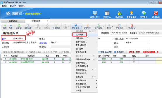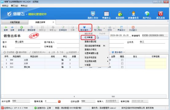 ????打開客戶名稱有誤的銷售出庫單,點(diǎn)擊“更多操作”—》“紅沖單據(jù)”,來將“已審核”的單據(jù)進(jìn)行紅沖,紅沖后的單據(jù)會變?yōu)闊o效,紅沖相當(dāng)于作廢,相應(yīng)的應(yīng)收款會刪除,之前對庫存的影響也會解除。如下圖所示:
