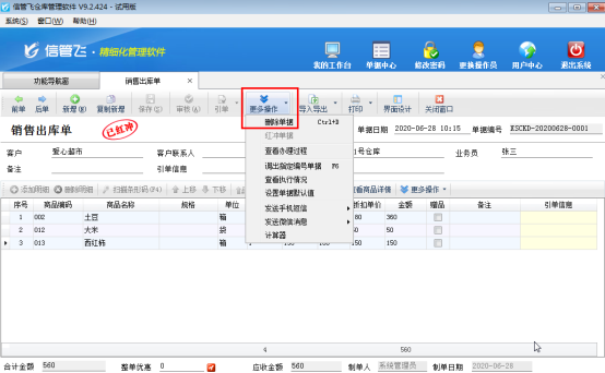 ????業(yè)務(wù)單據(jù)已審核后默認(rèn)是不允許刪除的,如果需要刪除,需要先紅沖此單據(jù),然后再刪除,即可刪除成功,在單據(jù)界面工具欄點(diǎn)擊“更多操作”—》“紅沖單據(jù)”即可紅沖單據(jù),如下圖所示: