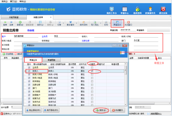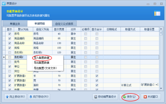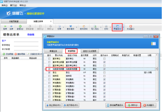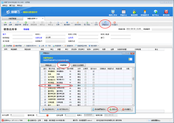 ????首先打開銷售出庫單開單界面,如下圖所示,軟件默認(rèn)不顯示“贈品”項(xiàng),需要先通過界面設(shè)計(jì)配置將“贈品”項(xiàng)勾選顯示出來。在工具欄點(diǎn)擊“界面設(shè)計(jì)”—》“單據(jù)明細(xì)”,找到“贈品”項(xiàng),將其勾選顯示出來,然后點(diǎn)擊“保存”按鈕保存設(shè)置。