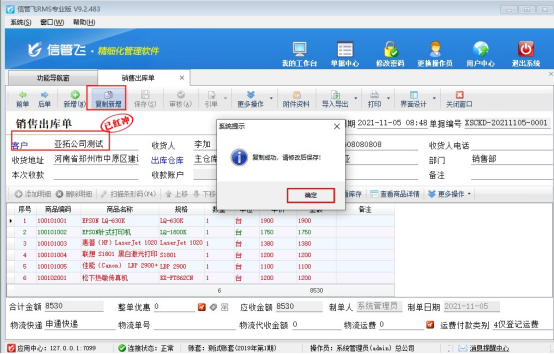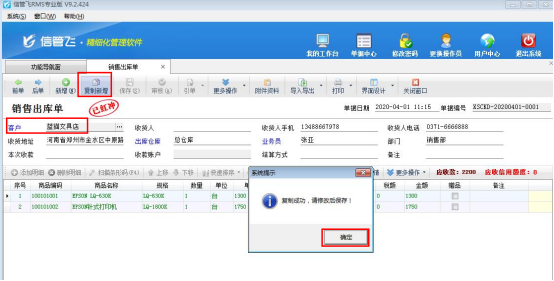 ????單據(jù)紅沖后,點(diǎn)擊工具欄中的“復(fù)制新增”按鈕,系統(tǒng)彈出提示框“復(fù)制成功,請修改后保存!”,點(diǎn)擊“確定”按鈕,如下圖所示: