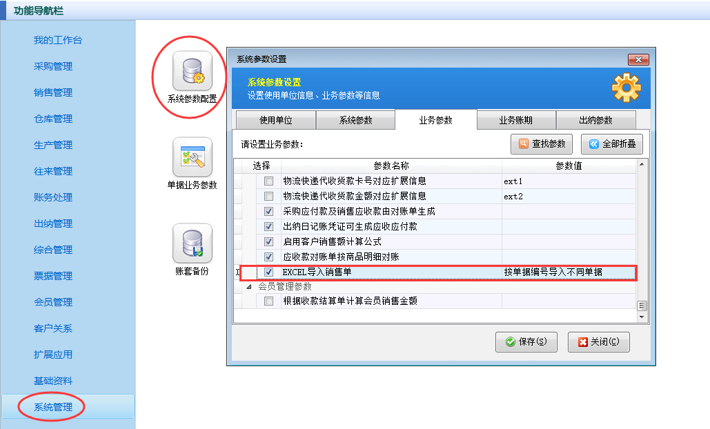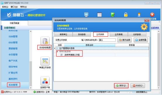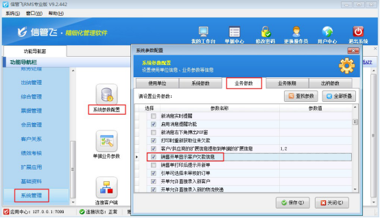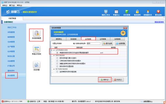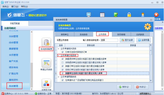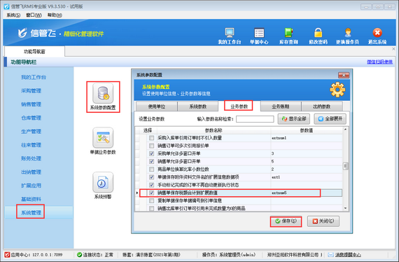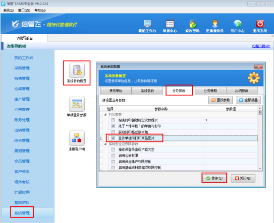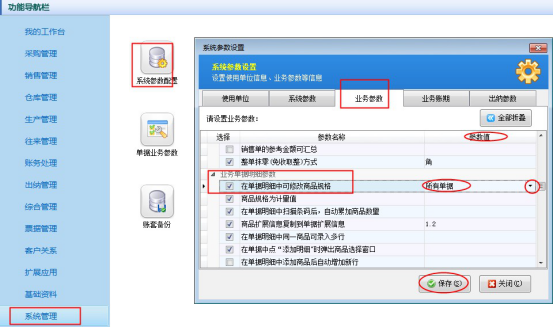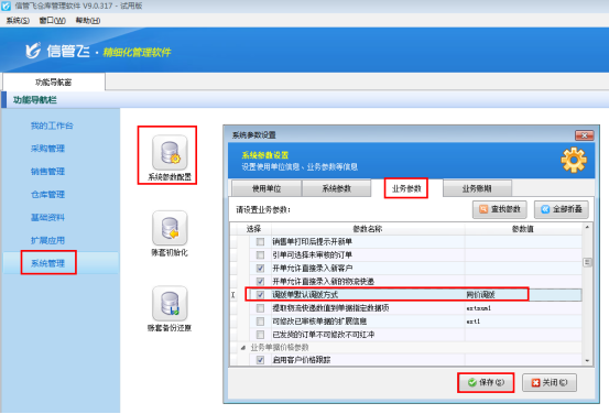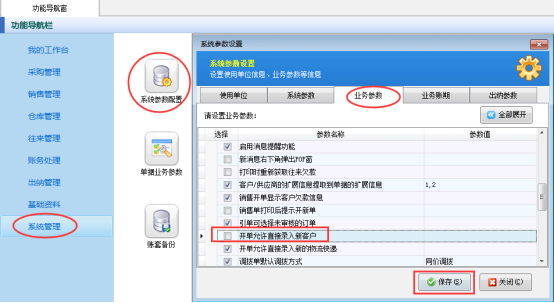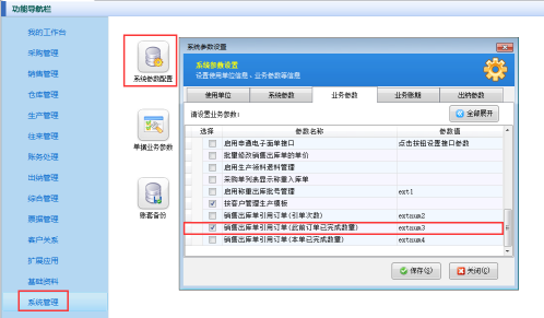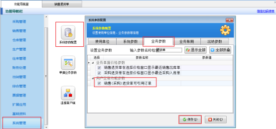 ????在功能導(dǎo)航窗點(diǎn)擊“系統(tǒng)管理”—》“系統(tǒng)參數(shù)配置”,進(jìn)入系統(tǒng)參數(shù)配置界面,點(diǎn)擊“業(yè)務(wù)參數(shù)”,勾選“銷售(采購)退貨單可引用訂單”參數(shù),點(diǎn)擊保存按鈕,如下圖所示: