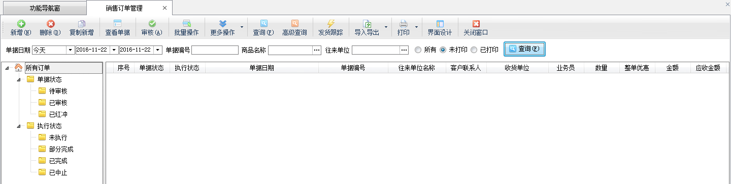 ????在功能導(dǎo)航窗點(diǎn)擊“銷售管理”—》“銷售訂單”即可進(jìn)入“銷售訂單管理”功能界面(圖一),銷售訂單管理以列表的形式顯示最近的銷售訂單,根據(jù)客戶名稱、單據(jù)日期、商品名稱及其他查詢條件可查詢出某一個時(shí)間段內(nèi)某個客戶的銷售訂貨情況、銷售訂單的執(zhí)行情況等,在工具欄點(diǎn)擊“新增”按鈕即可新增銷售訂單(圖二)。