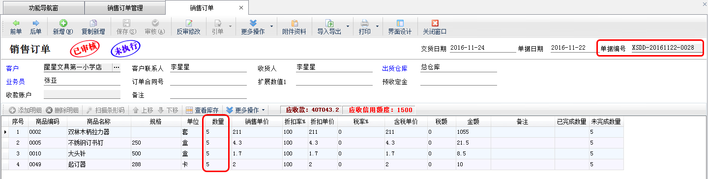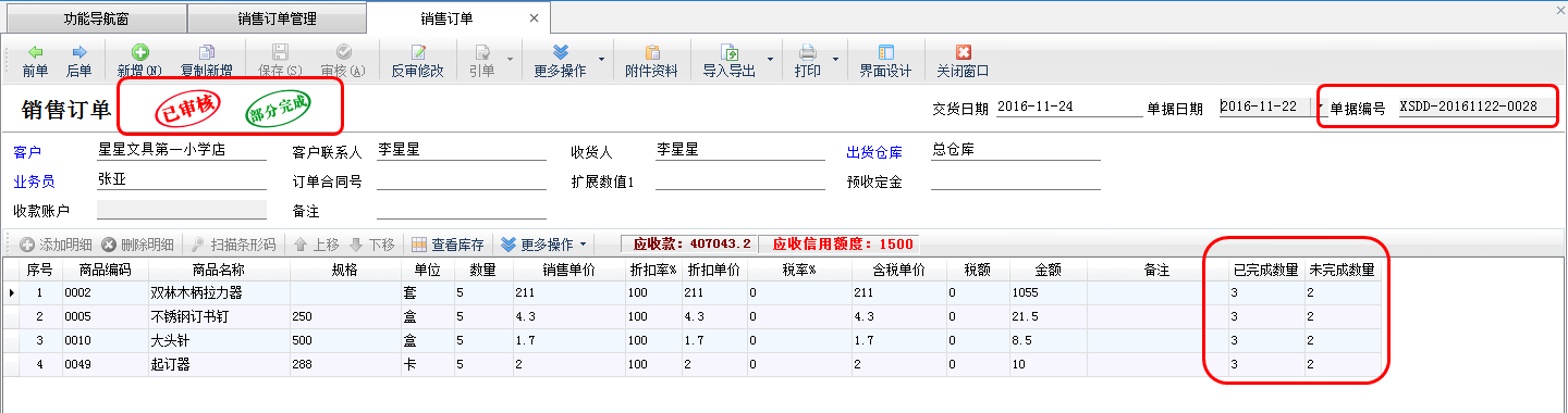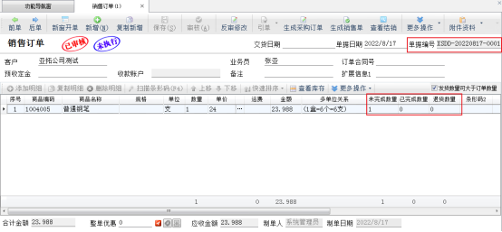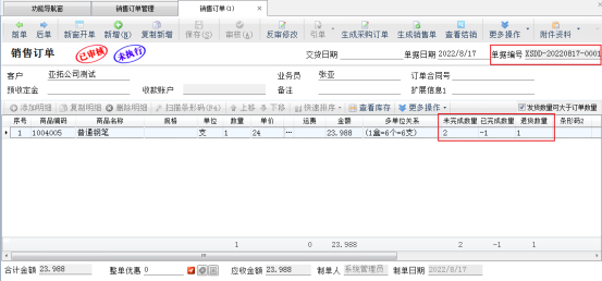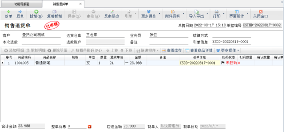 ????銷售退貨單引單訂單審核完成后,進(jìn)入銷售訂單管理界面,打開引單過的銷售訂單,可以看到訂單的完成數(shù)量以及退貨數(shù)量已更新。