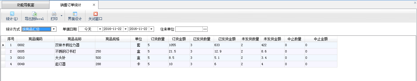 ????銷售訂單統(tǒng)計(jì):可以從商品、業(yè)務(wù)員、往來單位三種角度匯總銷售訂貨情況、已發(fā)貨情況、未發(fā)貨情況和中止情況。點(diǎn)“統(tǒng)計(jì)方式”可以選擇具體的統(tǒng)計(jì)方式,默認(rèn)會按照商品進(jìn)行統(tǒng)計(jì)。