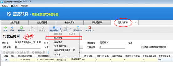 ????關(guān)閉“應(yīng)付款及結(jié)銷情況”界面,在付款結(jié)算單界面,工具欄“更多操作”下選擇“紅沖單據(jù)”,點(diǎn)擊“是”確定紅沖作廢當(dāng)前付款結(jié)算單,紅沖后應(yīng)付款的結(jié)銷狀態(tài)會由“已結(jié)銷”變?yōu)椤拔唇Y(jié)銷”,未結(jié)銷狀態(tài)下的采購入庫單單據(jù)可以修改,紅沖付款結(jié)算單單據(jù)后,返回至采購入庫單界面,可以點(diǎn)擊修改按鈕修改采購入庫單單據(jù),如下圖所示: