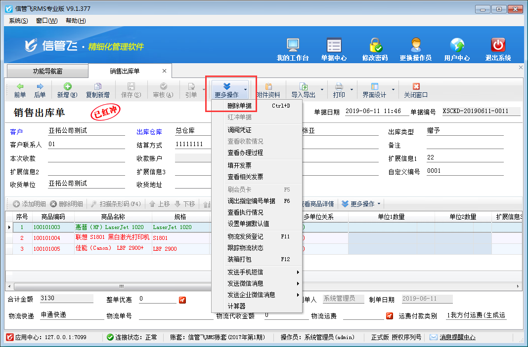 ????單據(jù)紅沖后即可進(jìn)行刪除操作,如下圖所示: