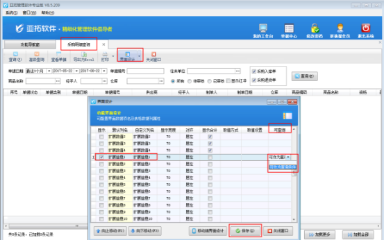 ????以“采購單明細(xì)查詢”為例,示范下如何在界面設(shè)計(jì)中配置。功能導(dǎo)航窗選擇“采購管理”在右側(cè)的查詢統(tǒng)計(jì)下打開“采購單明細(xì)查詢”進(jìn)入采購單明細(xì)查詢界面,點(diǎn)擊“界面設(shè)計(jì)”按鈕,在打開的界面設(shè)計(jì)窗口中找到“擴(kuò)展信息1”數(shù)據(jù)項(xiàng),勾選顯示并在可查詢處設(shè)置“可作為查詢條件”,然后保存設(shè)置,如下圖所示: