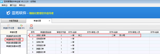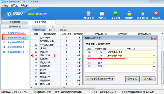 ????系統(tǒng)參數(shù)設(shè)置完成后,在“系統(tǒng)管理”→“單據(jù)業(yè)務(wù)參數(shù)”中選擇左側(cè)工具欄的“單據(jù)審核環(huán)節(jié)設(shè)置”,選擇“銷售出庫單”,點(diǎn)擊“單據(jù)環(huán)節(jié)設(shè)置”,啟用“一審”和“二審”并設(shè)置對應(yīng)審核環(huán)節(jié)的審核人員“張亞”和“李拓”,然后保存設(shè)置,如下圖所示: