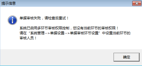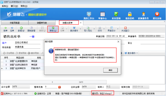 ????“一審”操作員“張亞”登錄軟件,新開銷售出庫單,保存并審核單據(jù),審核狀態(tài)顯示“一審”,操作員“張亞”沒有二審權(quán)限,再次點(diǎn)擊“審核”會提示“系統(tǒng)已啟用多環(huán)節(jié)審核權(quán)限控制,您沒有當(dāng)前環(huán)節(jié)的審核權(quán)限!”如下圖所示: