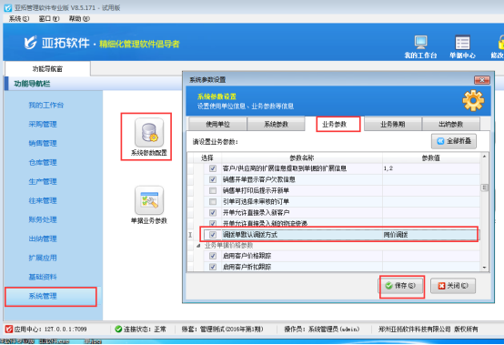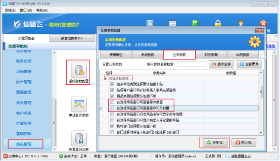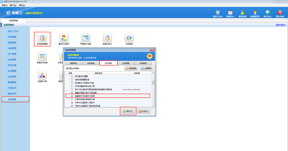 ????在功能導(dǎo)航窗點(diǎn)擊“系統(tǒng)管理”—》“系統(tǒng)參數(shù)配置”—》“業(yè)務(wù)參數(shù)”,進(jìn)入“業(yè)務(wù)參數(shù)”配置界面,在庫存管理參數(shù)中找到并勾選參數(shù)“允許0成本出入庫”,之后點(diǎn)擊“保存”,如下圖所示: