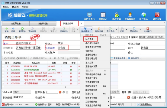 ????信管飛RMS、信管飛倉庫管理軟件中采購單、銷售單等單據(jù)審核后,如果發(fā)現(xiàn)單據(jù)錄入的數(shù)據(jù)有問題,可以點(diǎn)工具欄中的“反審修改”按鈕,可以對已審核的單據(jù)進(jìn)行修改,修改后直接保存即可生效,對于已審核單據(jù)的客戶名稱、倉庫名稱系統(tǒng)不支持直接反審修改。部分用戶有時(shí)單據(jù)審核后發(fā)現(xiàn)客戶名稱錄錯了,單據(jù)明細(xì)內(nèi)容比較多,從新開單又比較耗時(shí),此時(shí)該如何處理呢?下面以信管飛RMS專業(yè)版的銷售出庫單為例,介紹一下快捷的解決方法。