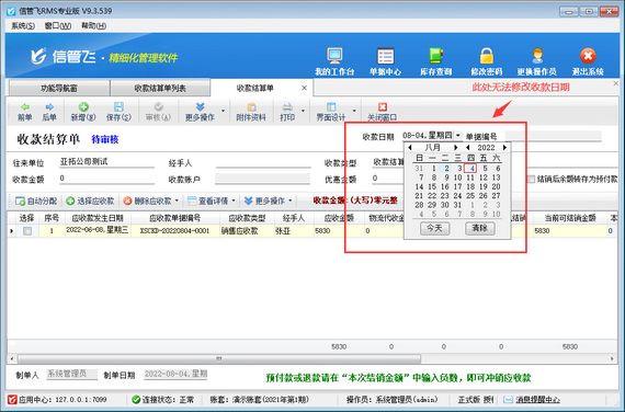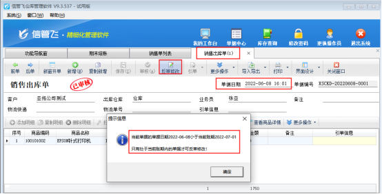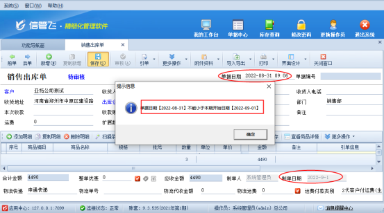 ????信管飛RMS專業(yè)版軟件在補(bǔ)錄之前日期單據(jù)保存時(shí),提示以下消息“單據(jù)日期【2022-08-31】不能小于本期開始日期【2022-09-01】”,如下圖所示,出現(xiàn)此提示該如何解決?本文進(jìn)行示范操作。