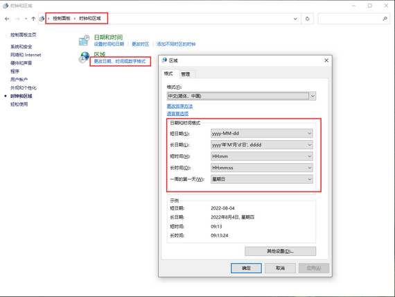 ????出現(xiàn)這個問題的原因是因?yàn)閃indows操作系統(tǒng)的日期格式與軟件數(shù)據(jù)庫中的日期格式設(shè)置不一致導(dǎo)致的。處理方法是調(diào)整系統(tǒng)日期顯示格式,打開“控制面板”→“時(shí)鐘和區(qū)域”→“更改日期、時(shí)間或數(shù)字格式”,如下圖所示設(shè)置系統(tǒng)日期格式,然后點(diǎn)擊應(yīng)用、確定按鈕完成操作。