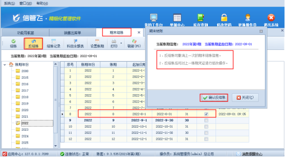????出現(xiàn)此提示,是因?yàn)檐浖寻?月份賬已結(jié)賬導(dǎo)致,結(jié)賬后賬期內(nèi)單據(jù)無法修改和新增,需要補(bǔ)錄8月份的單據(jù),需要先進(jìn)行“反結(jié)賬”操作,在功能導(dǎo)航窗點(diǎn)擊“財(cái)務(wù)處理”—“期末結(jié)賬”。在期末結(jié)賬界面可看到當(dāng)前結(jié)賬日期到2022-8-31,點(diǎn)擊工具欄“反結(jié)賬”按鈕,彈出提示消息,點(diǎn)擊“確認(rèn)反結(jié)賬”,賬期往后倒一個月,結(jié)賬時(shí)間到2022-7-31,如下圖所示: