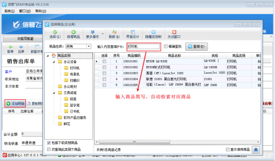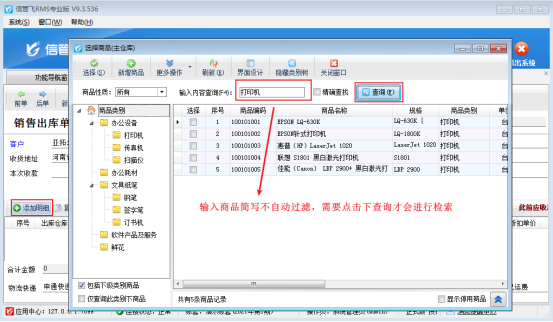 ????信管飛RMS軟件開單前可提前維護(hù)好商品信息到基礎(chǔ)資料中,新開單據(jù)選擇客戶后,點(diǎn)擊“添加明細(xì)”可彈出選擇商品界面,可選擇添加好的商品信息,有用戶反映在選擇商品界面,查詢窗口輸入商品簡寫不自動過濾,需要點(diǎn)擊下查詢才會進(jìn)行檢索,如下圖所示:
