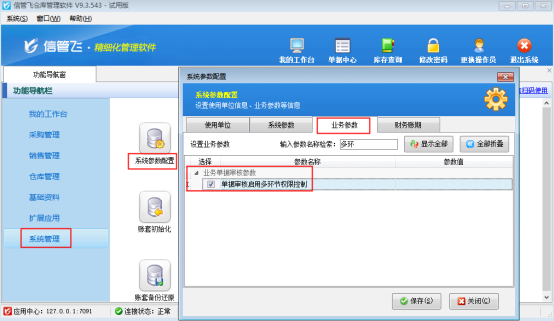 ????軟件多級審核最多支持5級審核,支持設(shè)置各類單據(jù)。本文以“銷售出庫單”為例示范。首先需啟用參數(shù),在功能導(dǎo)航窗點(diǎn)“系統(tǒng)管理”→“系統(tǒng)參數(shù)配置”→“業(yè)務(wù)參數(shù)”,勾選“單據(jù)審核啟用多環(huán)節(jié)權(quán)限控制”,點(diǎn)擊“保存”按鈕,如下圖所示: