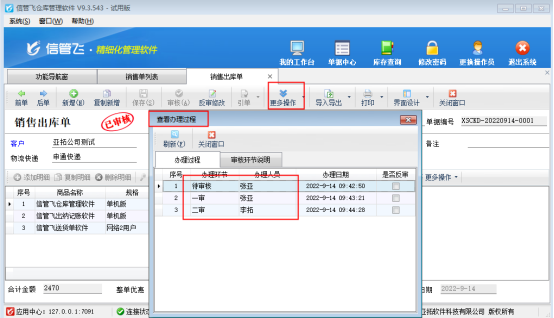 ????關(guān)閉當(dāng)前單據(jù)界面。點(diǎn)擊“更換操作員”,切換為“二審”操作員“李拓”登錄軟件,在銷售管理→銷售單列表找到相同單據(jù)打開,點(diǎn)擊“審核”按鈕,軟件會更新審核狀態(tài)由“一審”變?yōu)椤耙褜徍恕保诠ぞ邫凇案嗖僮鳌毕曼c(diǎn)擊“辦理過程”,能一目了然看到這個單據(jù)在每個審核環(huán)節(jié)操作的信息。如下圖所示: