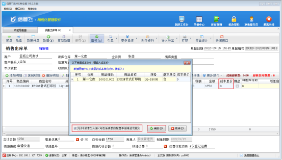 ????設(shè)置完成后,在功能導(dǎo)航窗點(diǎn)擊“銷售管理”—》“銷售出庫單”,新開銷售出庫單,此時(shí)如果商品的成本單價(jià)為0,審核單據(jù)時(shí)會出現(xiàn)“以下商品成本價(jià)為0,請輸入成本價(jià)”的提示信息,這時(shí)需要勾選左下方允許0成本出入庫,之后點(diǎn)擊“確定”,單據(jù)可審核成功,如下圖所示: