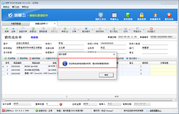 ????設(shè)置完成之后,使用操作員賬號“張亞”登錄軟件,打開一個銷售出庫單,然后點(diǎn)擊“更多操作”→“發(fā)送微信消息”→“發(fā)送微信模板消息”進(jìn)行發(fā)送微信消息通知時(shí),系統(tǒng)會彈出提示信息“您沒有發(fā)送微信消息的權(quán)限,請于系統(tǒng)管理員聯(lián)系!”,如下圖所示。