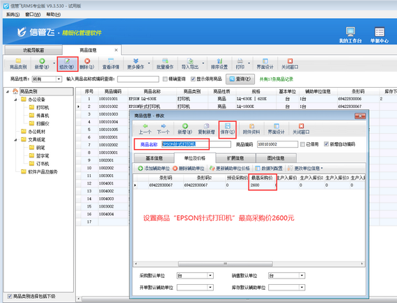 ????在功能導(dǎo)航窗點(diǎn)擊“基礎(chǔ)資料”—》“商品信息”即可打開“商品信息”界面,然后選擇商品,點(diǎn)擊“修改”按鈕,在“單位及價(jià)格”標(biāo)簽頁可設(shè)置商品“最高采購價(jià)”,如下圖所示,設(shè)置商品“EPSON針式打印機(jī)”最高采購價(jià)為2600元。