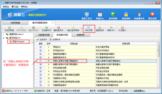 ????在功能導(dǎo)航窗點(diǎn)擊“系統(tǒng)管理”—》“操作員及授權(quán)”,進(jìn)入“操作員管理及授權(quán)”界面,選擇操作員賬號,然后在“其他操作權(quán)限”界面將“采購入庫單價(jià)可高于最高進(jìn)價(jià)”權(quán)限勾選取消,然后保存權(quán)限設(shè)置,如下圖所示,設(shè)置操作員“張亞”采購入庫單價(jià)不可高于最高進(jìn)價(jià)。
