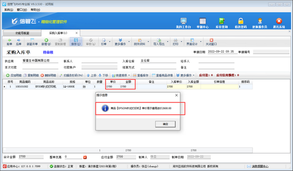 ????設(shè)置完成之后,使用操作員賬號“張亞”登錄軟件,新增一個采購入庫單,選擇商品“EPSON針式打印機(jī)”以2700元(最高采購價(jià)2600元)的采購單價(jià)進(jìn)行采購入庫,保存單據(jù)時(shí),系統(tǒng)會彈出提示信息“商品【EPSON針式打印機(jī)】單價(jià)高于最高進(jìn)價(jià)2600元”,無法保存,如下圖所示。