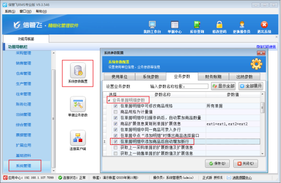 ????在功能導(dǎo)航窗點(diǎn)擊“系統(tǒng)管理”—》“系統(tǒng)參數(shù)設(shè)置”—》“業(yè)務(wù)參數(shù)”,然后在業(yè)務(wù)單據(jù)明細(xì)參數(shù)中啟用“在單據(jù)明細(xì)中添加商品后自動增加新行”參數(shù),如下圖所示: