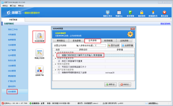 ????在功能導(dǎo)航窗點(diǎn)擊“系統(tǒng)管理”—》“系統(tǒng)參數(shù)設(shè)置”—》“業(yè)務(wù)參數(shù)”,然后在業(yè)務(wù)單據(jù)相關(guān)參數(shù)中取消勾選“銷售訂單的自定義編號不允許輸入(取單據(jù)編號)”參數(shù),之后點(diǎn)擊保存按鈕,如下圖所示:
