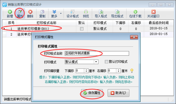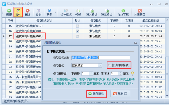 ????設(shè)置完成后,為方便和原來的默認(rèn)模板區(qū)分,退回至打印格式設(shè)計界面,選擇導(dǎo)入的打印格式點擊屬性按鈕,可修改下打印格式名稱,如下圖所示: