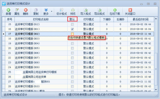 ????二、在默認(rèn)框中雙擊快速設(shè)置為默認(rèn)模板,在打印模板后邊的默認(rèn)選擇框中,雙擊此處可以快速把模板設(shè)置為默認(rèn)模板,如下圖所示: