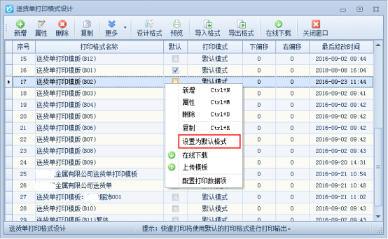 ????一、在打印格式設(shè)計界面工具欄的“屬性”中進(jìn)行操作。如示例需要設(shè)置“送貨單打印模板(B02)”為默認(rèn)模板,選擇B02模板,點擊工具欄中的“屬性”,彈出的打印格式屬性界面,在“默認(rèn)打印格式”處打勾,然后保存屬性。如下圖所示:
