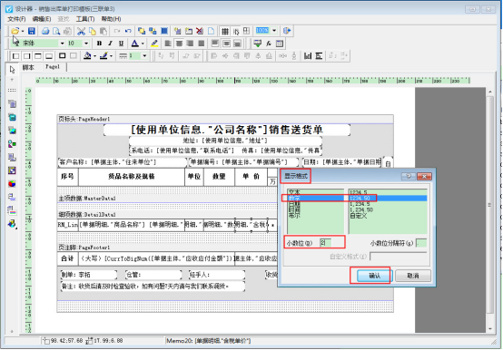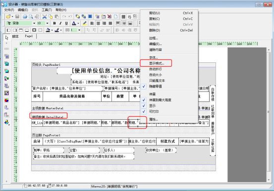 ????設(shè)置打印模板和單據(jù)界面一致,在開好的單據(jù)界面選擇“打印”—》“打印格式設(shè)計”—》“設(shè)計格式”,進(jìn)入打印設(shè)計器界面,選擇細(xì)項數(shù)據(jù)的單價文本框,右鍵選擇“顯示格式”,如下圖所示: